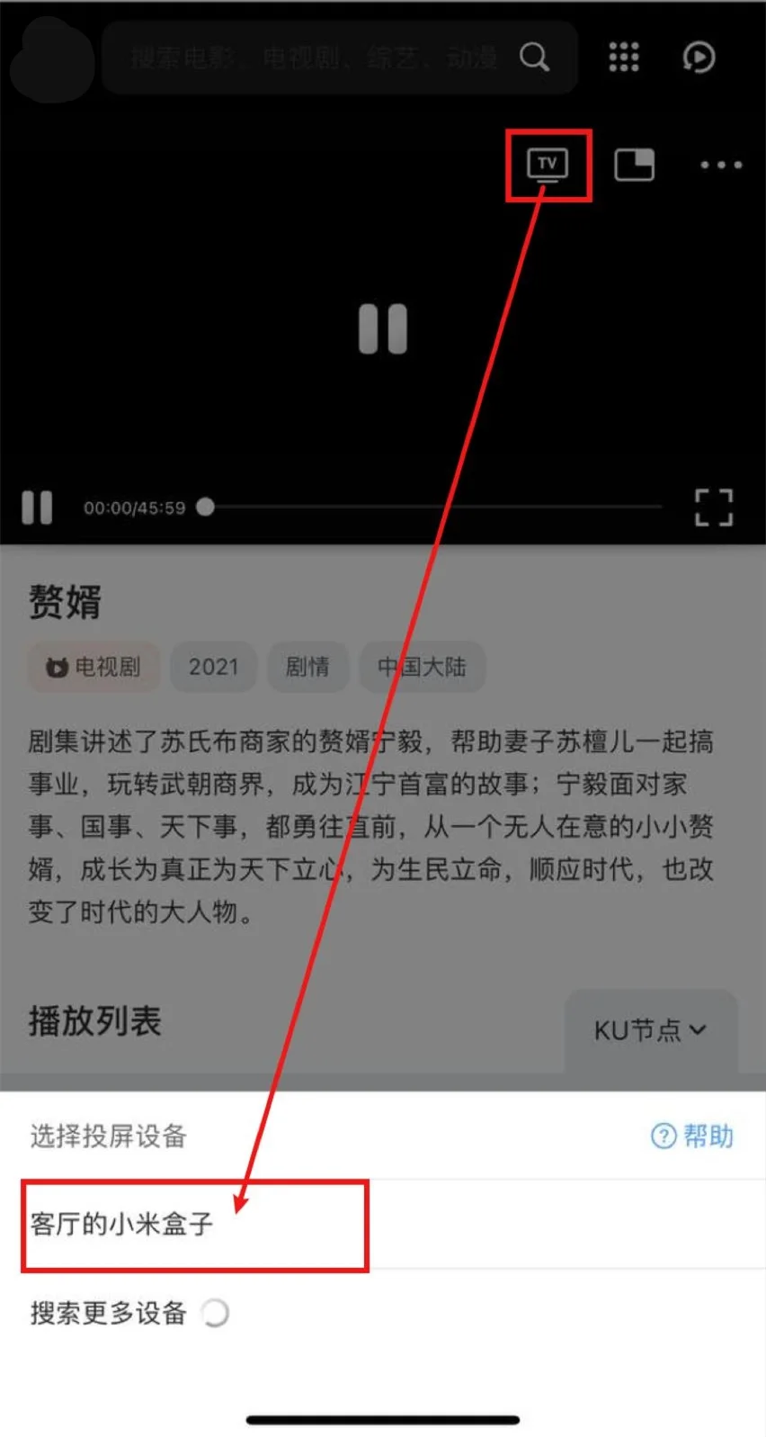 打开QQ浏览器(会接管网页播放器)->打开可乐私人影院->播放视频->选中投屏图标->等待搜寻出智能电视/电视盒子->选中,即可投屏。